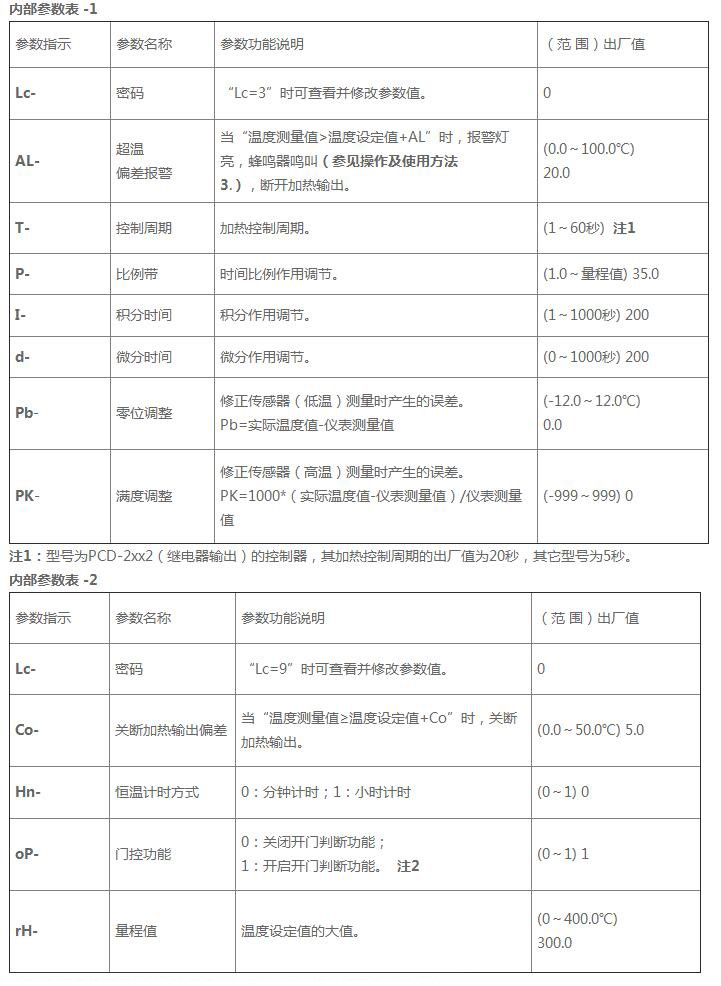 長按設(shè)定鍵約3秒,控制器顯示窗下排顯示密碼提示符“Lc”,上排顯示密碼值,通過增加、減少和移位鍵,修改到所需的密碼值。再點擊設(shè)定鍵,若密碼值不正確,控制器自動返回到正常顯示狀態(tài),若密碼值正確,則進入到溫度內(nèi)部參數(shù)設(shè)定狀態(tài),再點擊設(shè)定鍵可以依次修改各個參數(shù)。再長按設(shè)定鍵3秒,可以退出此狀態(tài),參數(shù)值自動保存。